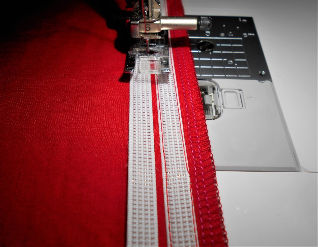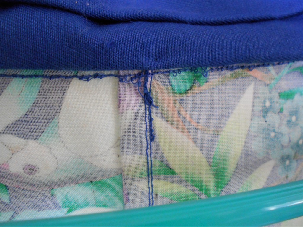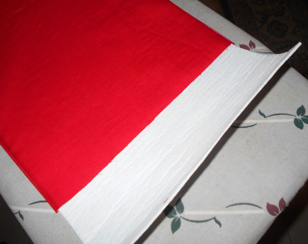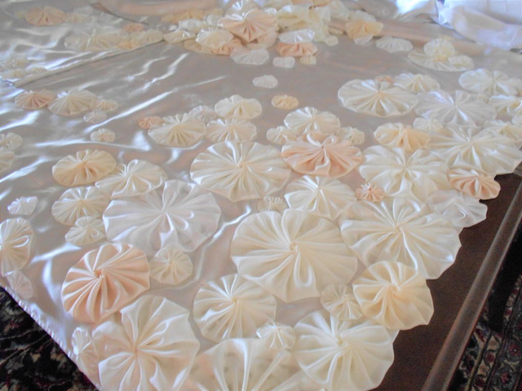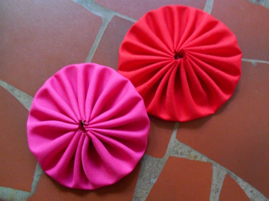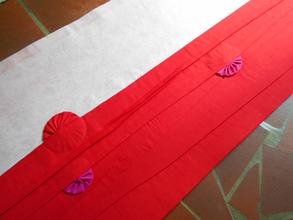 Once satisfied, it was time to steam press the folds that were pinned to the fusible web and then, voilà ! Secured drapes ! “Ah, but what are those round starburst “gears” peeking out from beneath the folds ?” you question. Those are called yo-yos, commonly made by quilters and used for handicrafts and decorations.