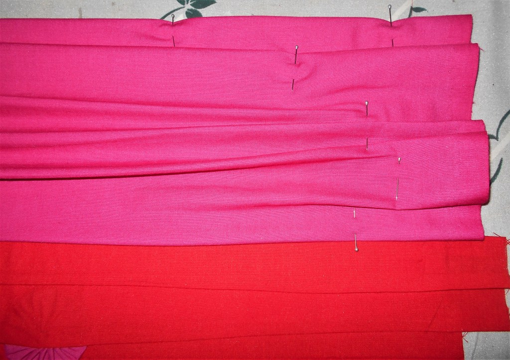 Have you ever wondered how random drapes are made ? It’s simple and a lot of fun ! Cut a strip of fabric that is at least twice the height of the area that needs to be draped. For example, each horizontal half of my belt measured about 15 cm (for a total width of ~30 cm, top to bottom) so I cut pieces of fabric that were over 30 cm each and stretched the swath side to side, placing pins where the folds and creases looked appealing to me.