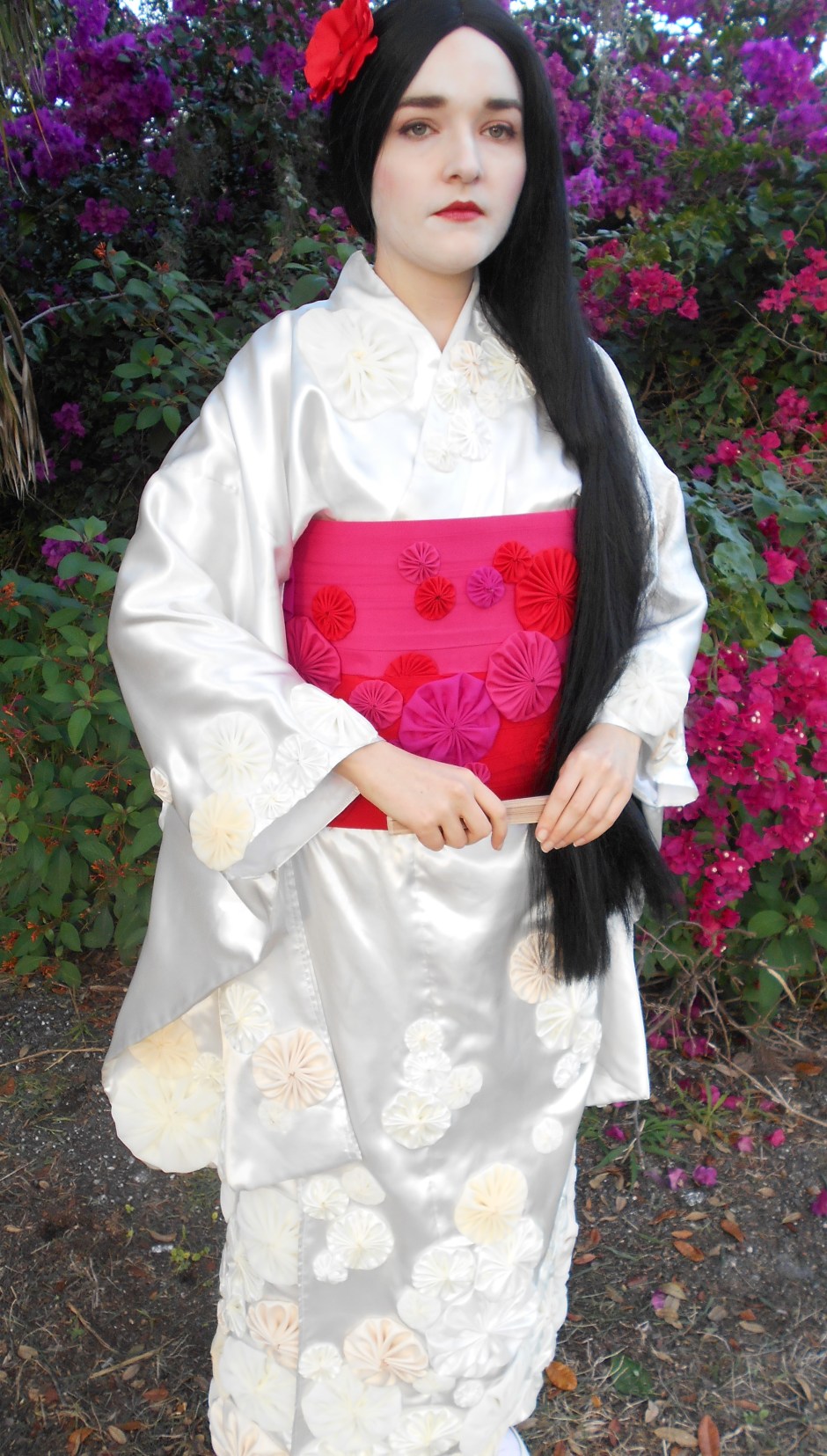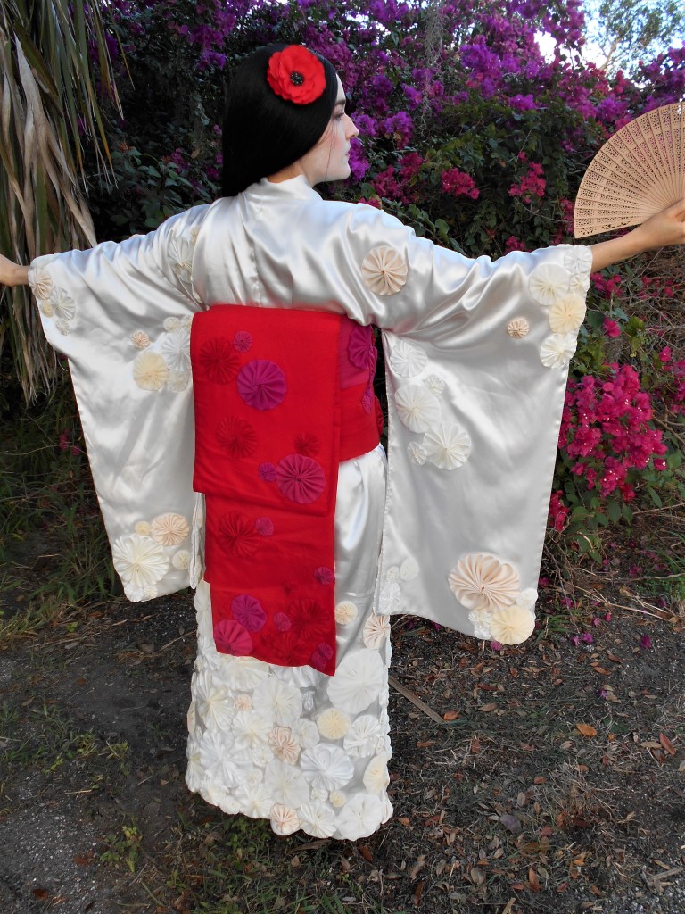 The glue dried with not a moment to spare and the following morning, I suited up in my silky kimono, applied a waxy whiteface, donned a long black wig, and clipped on a red poppy.