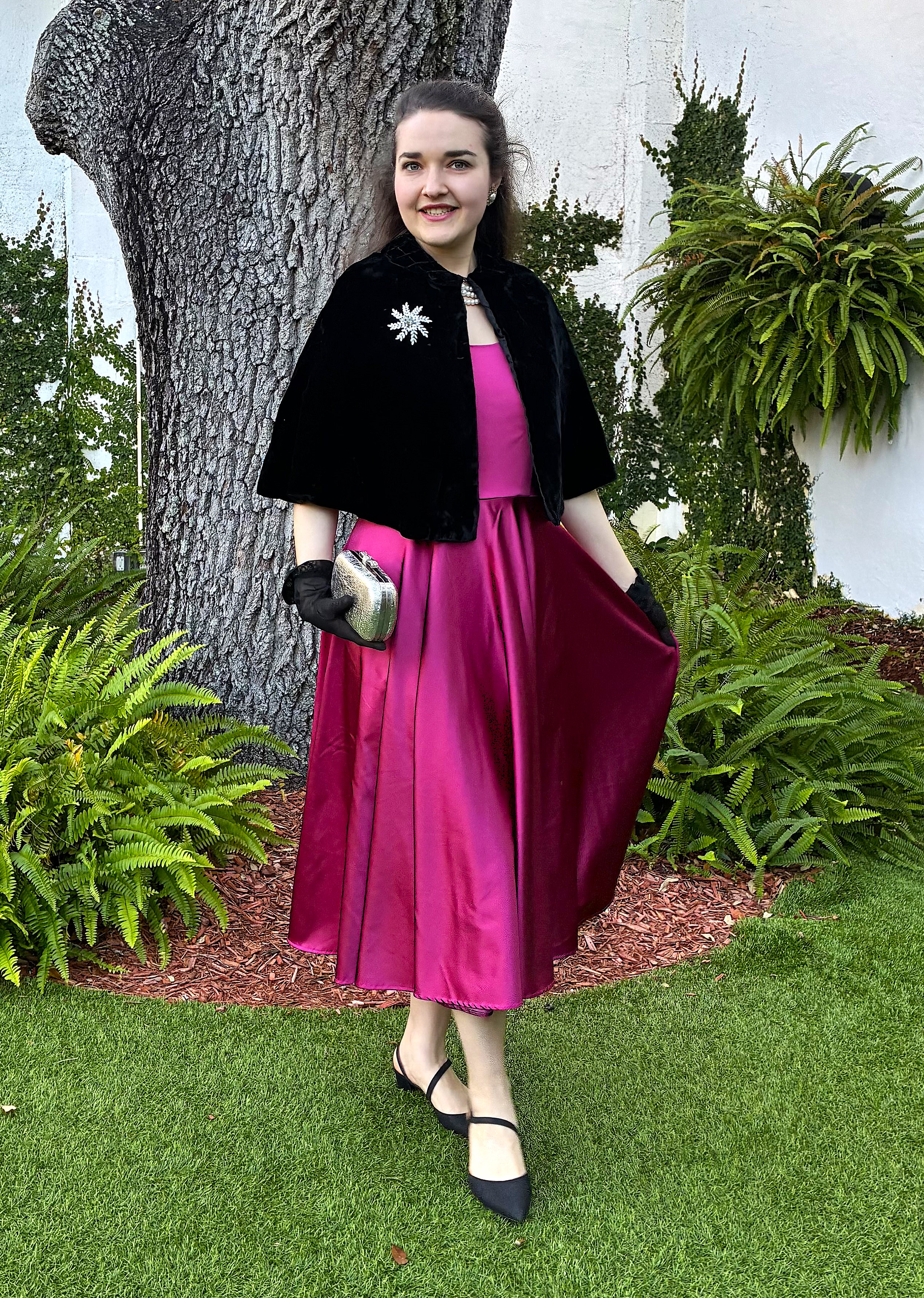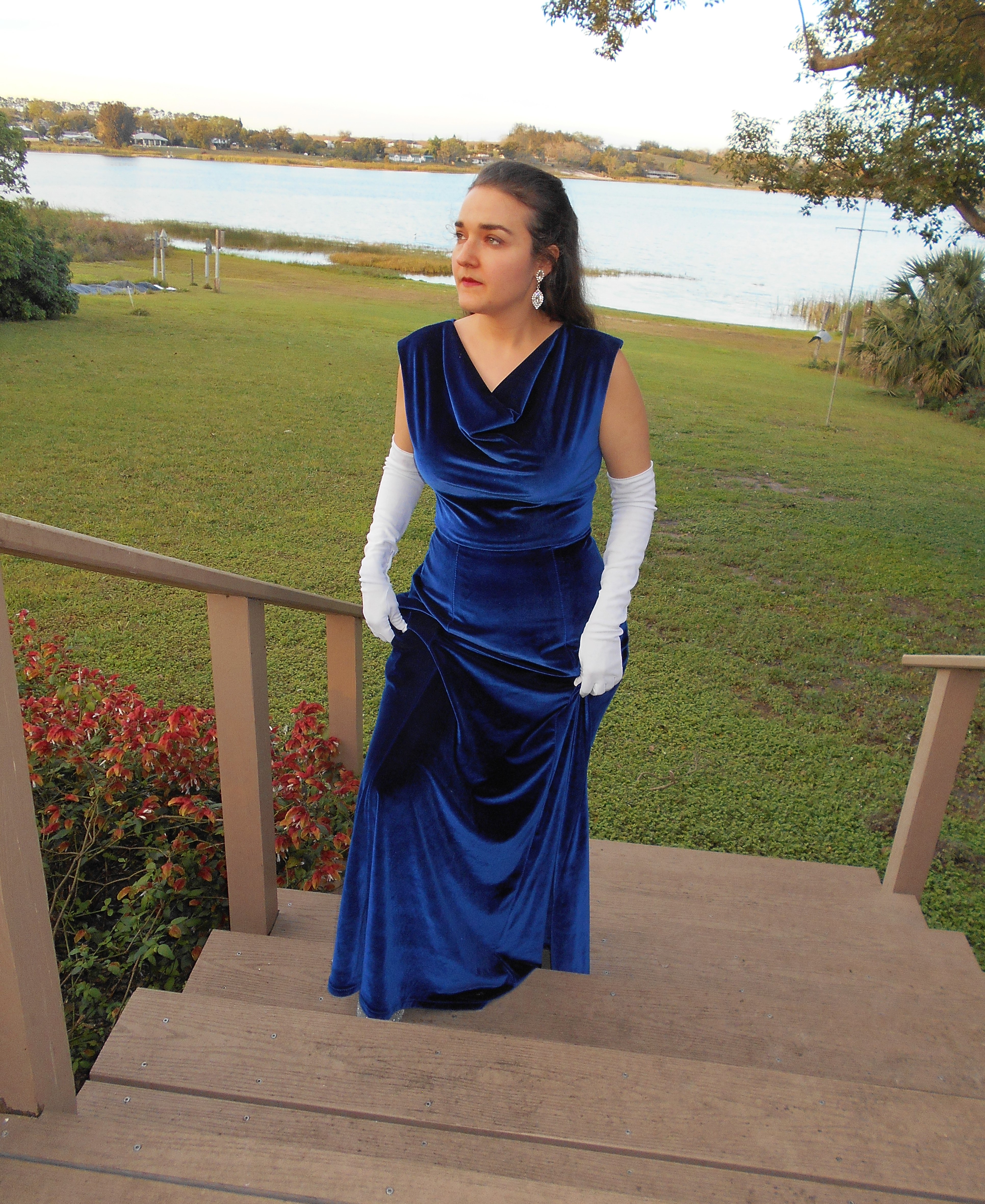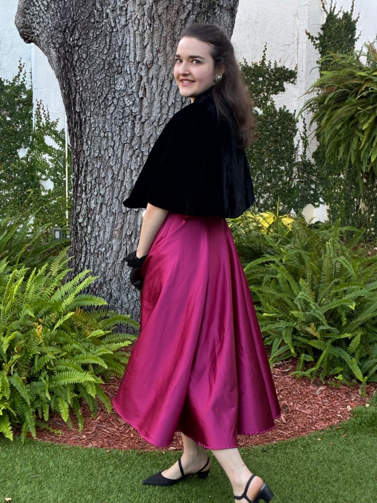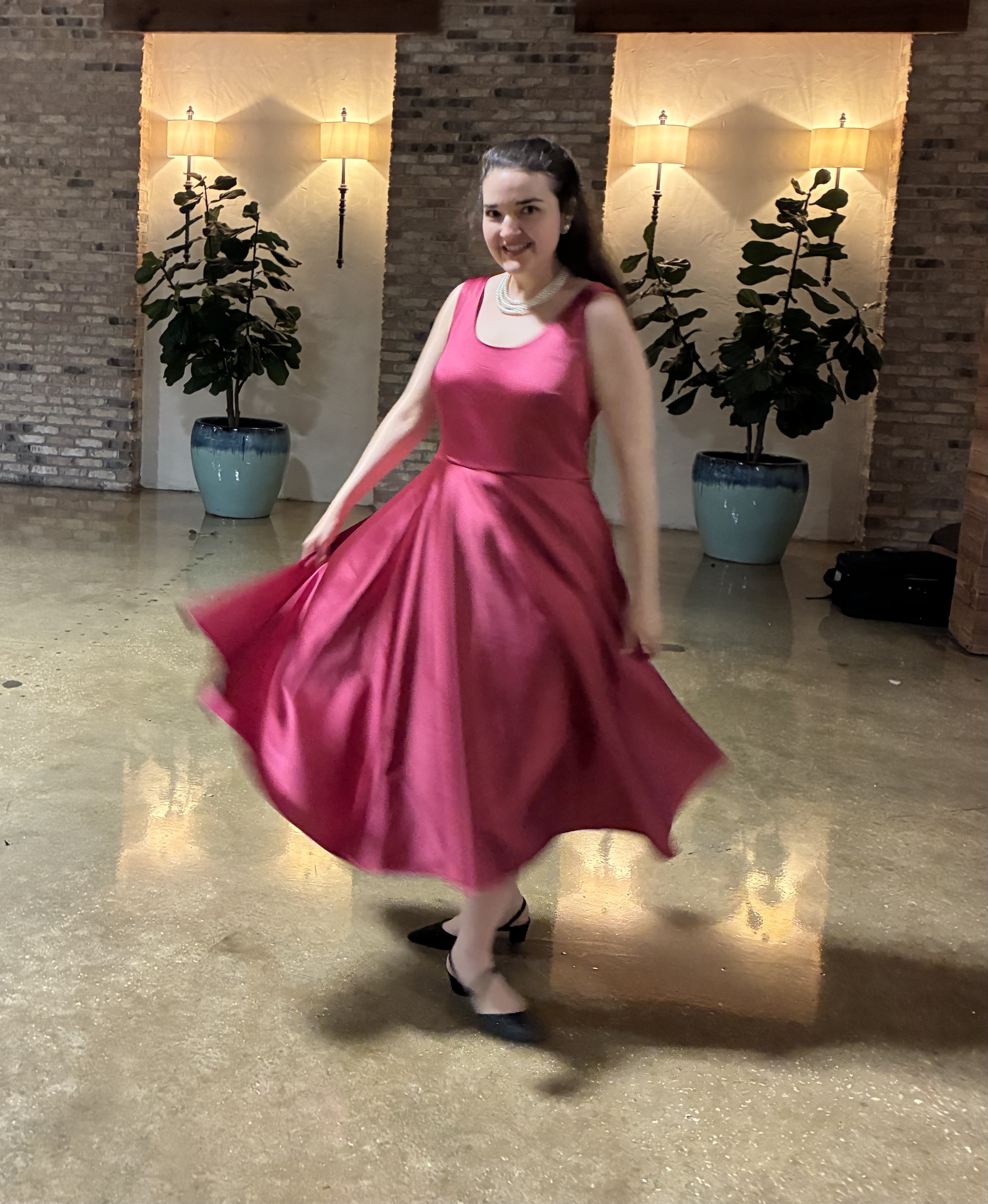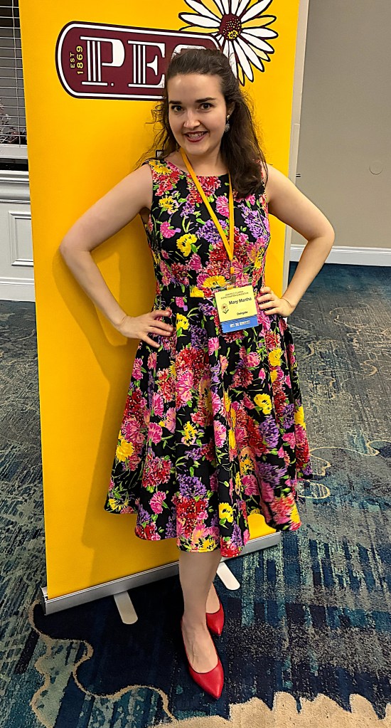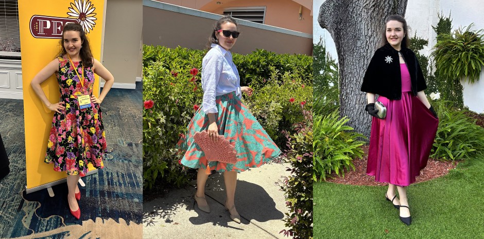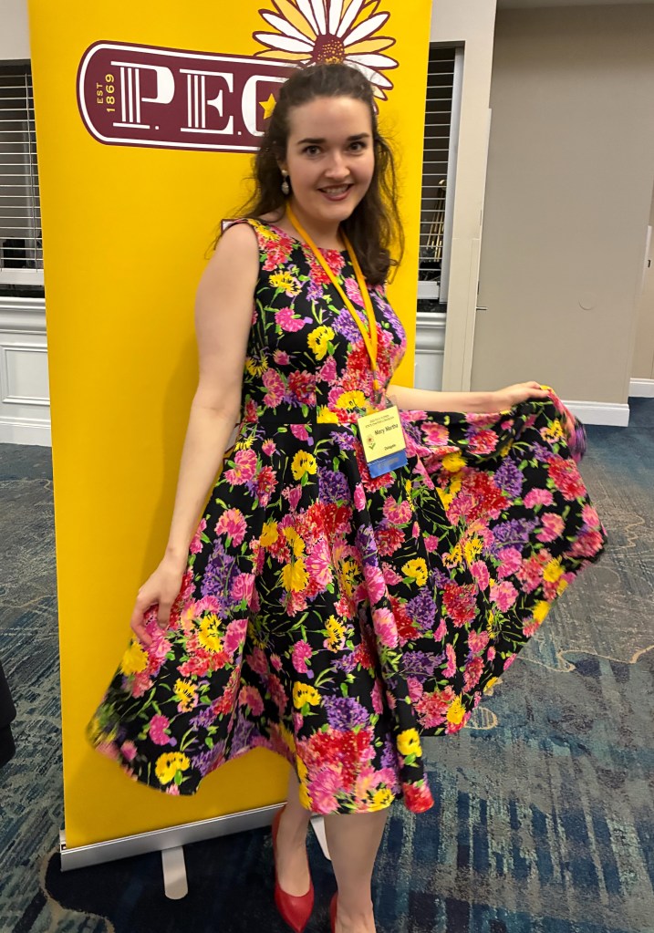 Watching the videos, along with reading several blog posts and sewing a plethora of mock-ups, helped me achieve a near perfect fit on a bodice block that was far from my measurements and bone structure. My first dress was made out of a stretch cotton sateen bottomweight in a vibrant floral print. Its first public appearance was at the Florida State P.E.O. Convention during the Friday night social and helped me to feel like a butterfly, flitting around the dance floor in that voluminous skirt.