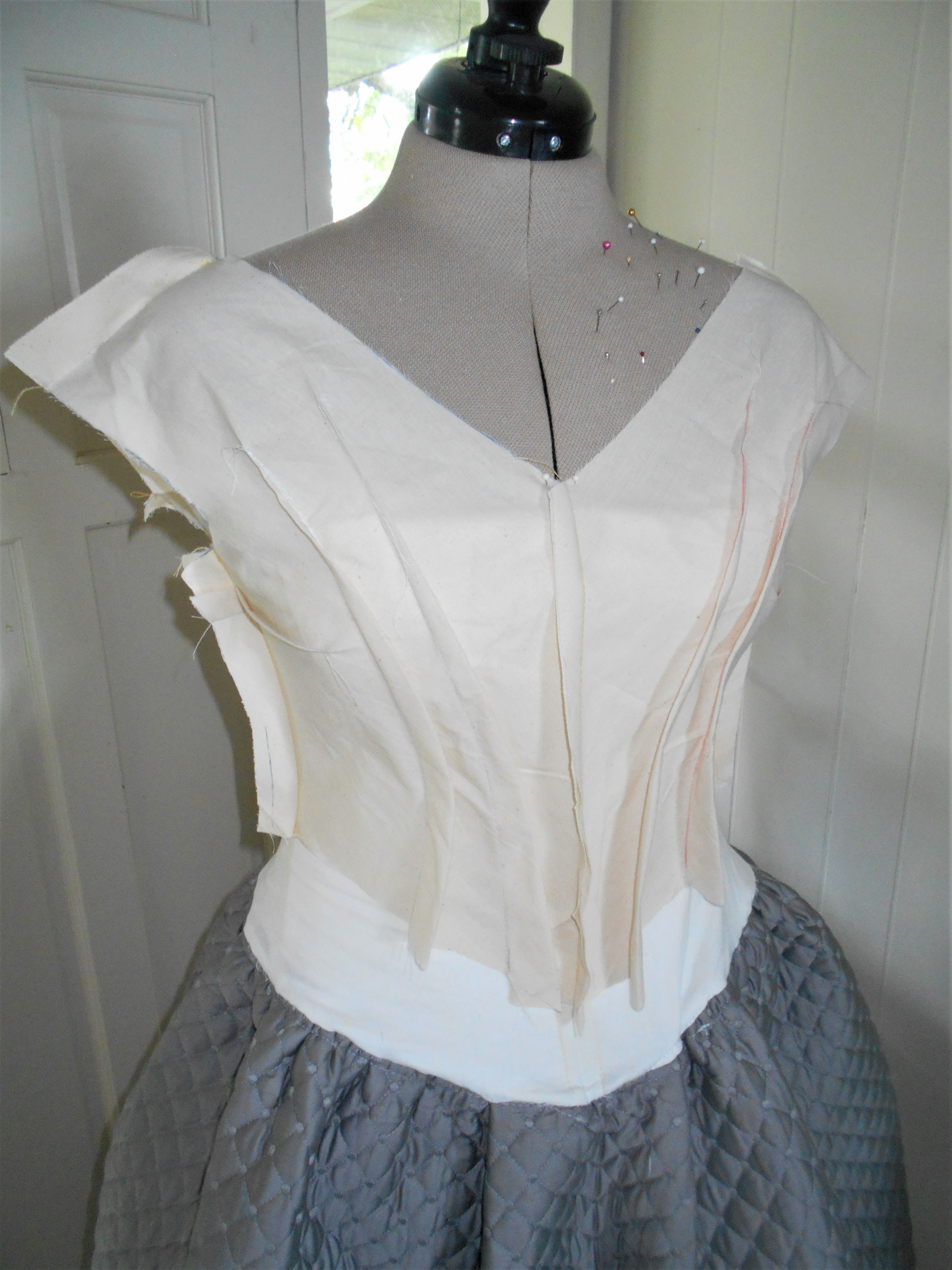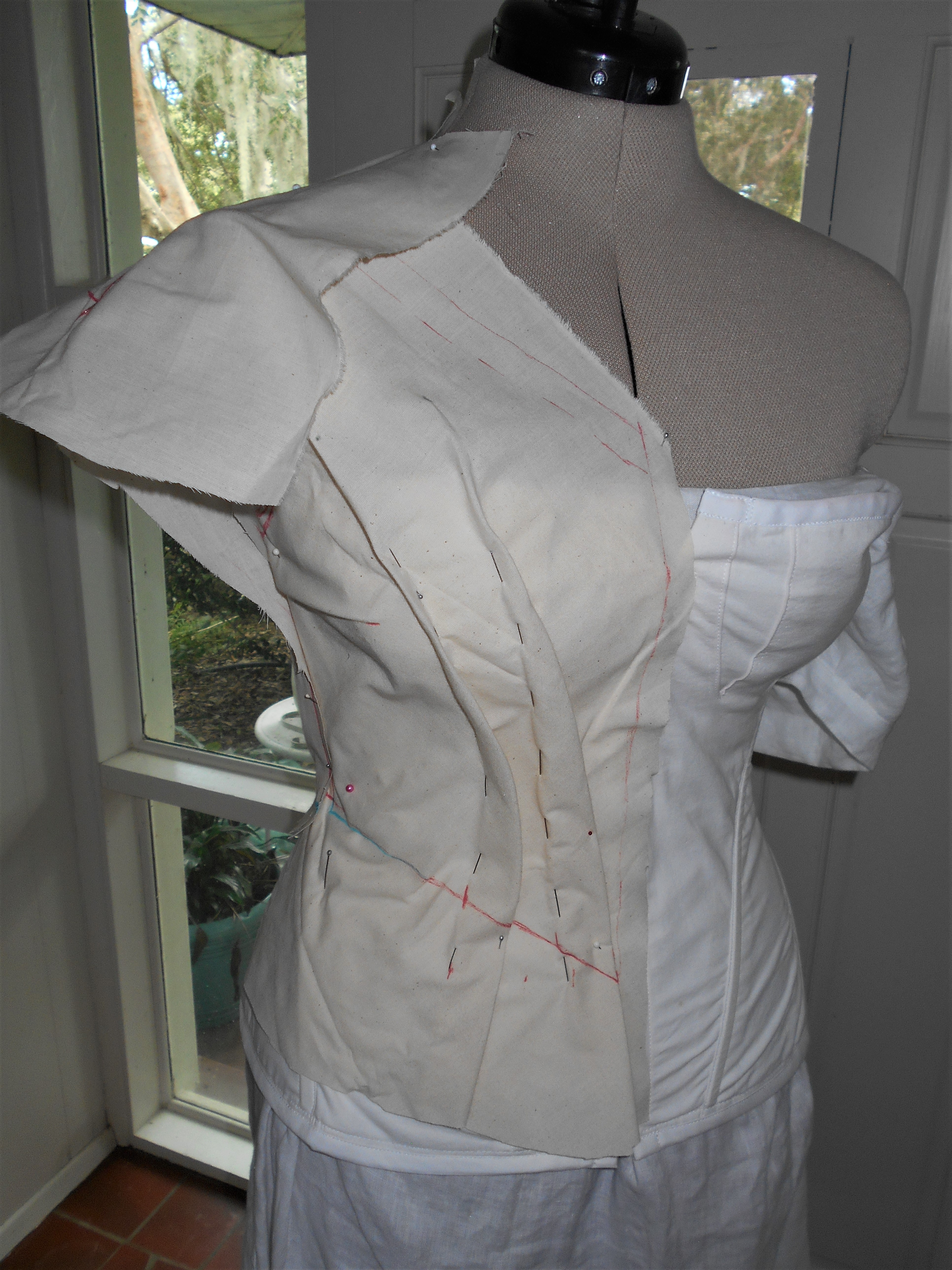 Although enlarging the corresponding pattern pieces in the book to their proper scale (800%), an initial mock-up proved that more alterations would be needed in order to have the dress fit my figure. Time was like quicksand through the hourglass and the thought of applying modern day adjustments was a hopeless endeavour. Another thought popped into my mind: draping !