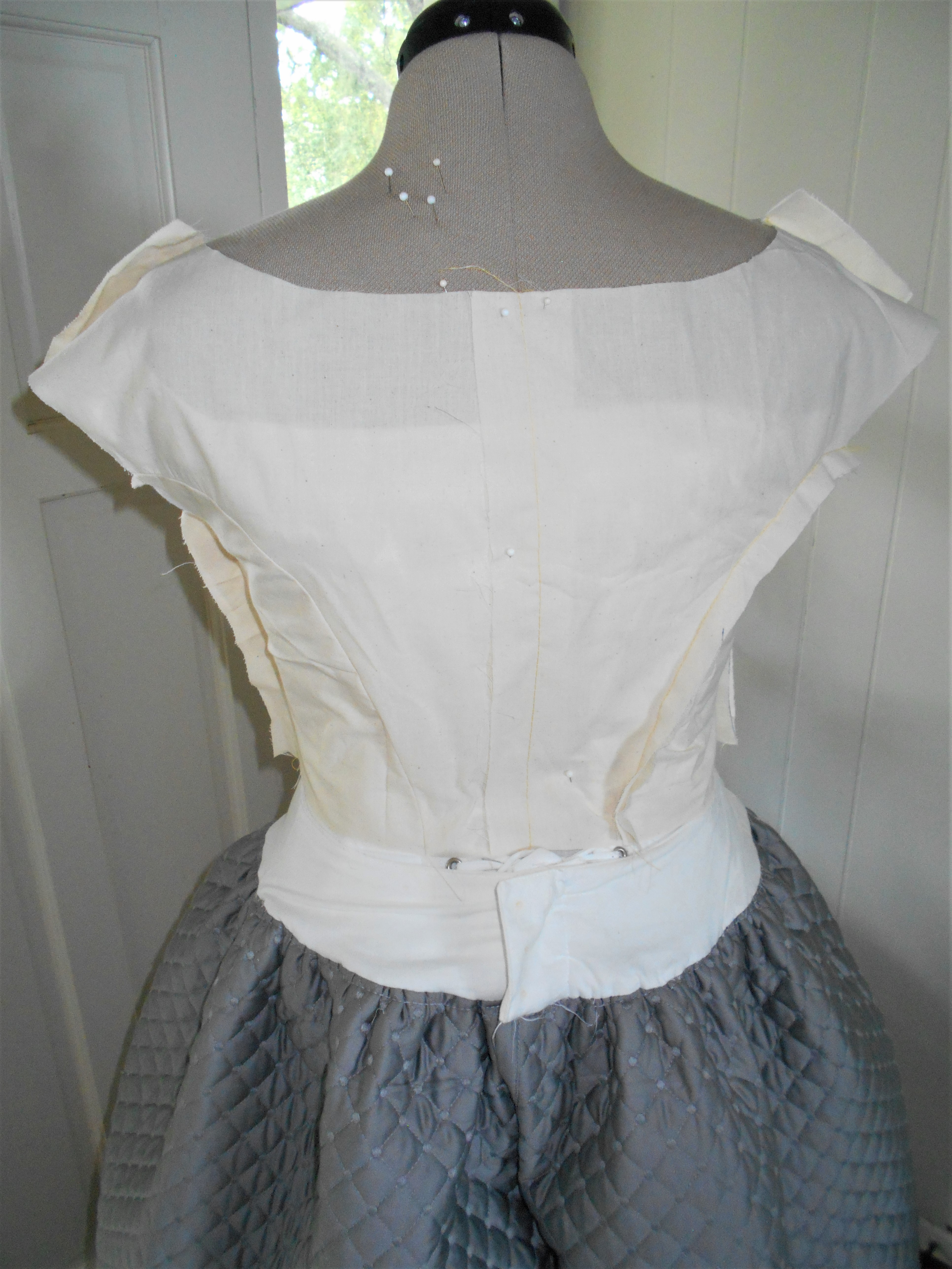 In addition to draping, I also tried my hand at cartridge pleating for the skirt, piped the armholes and waistline, and used a hook and eye placket to close the back. So 1840’s !