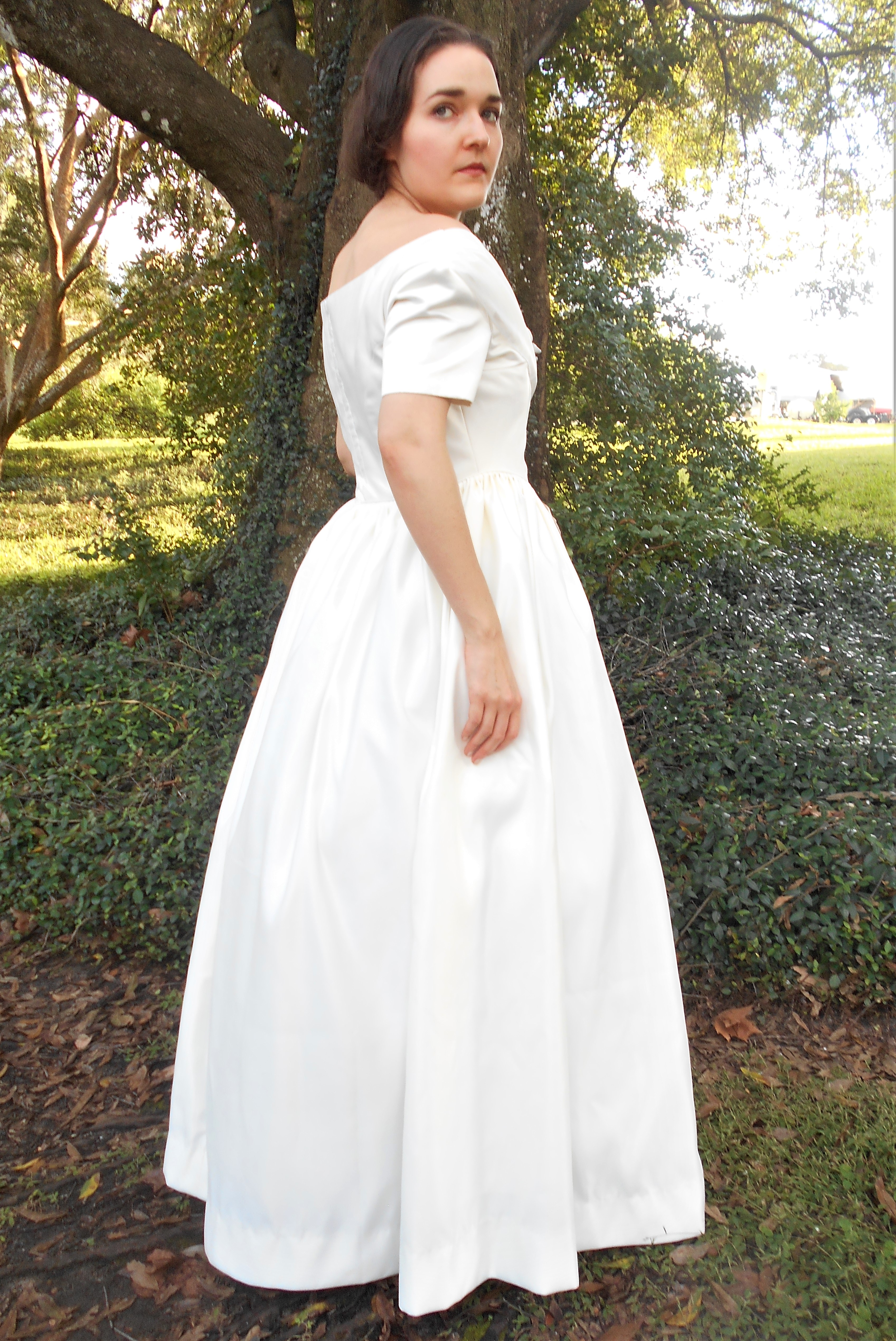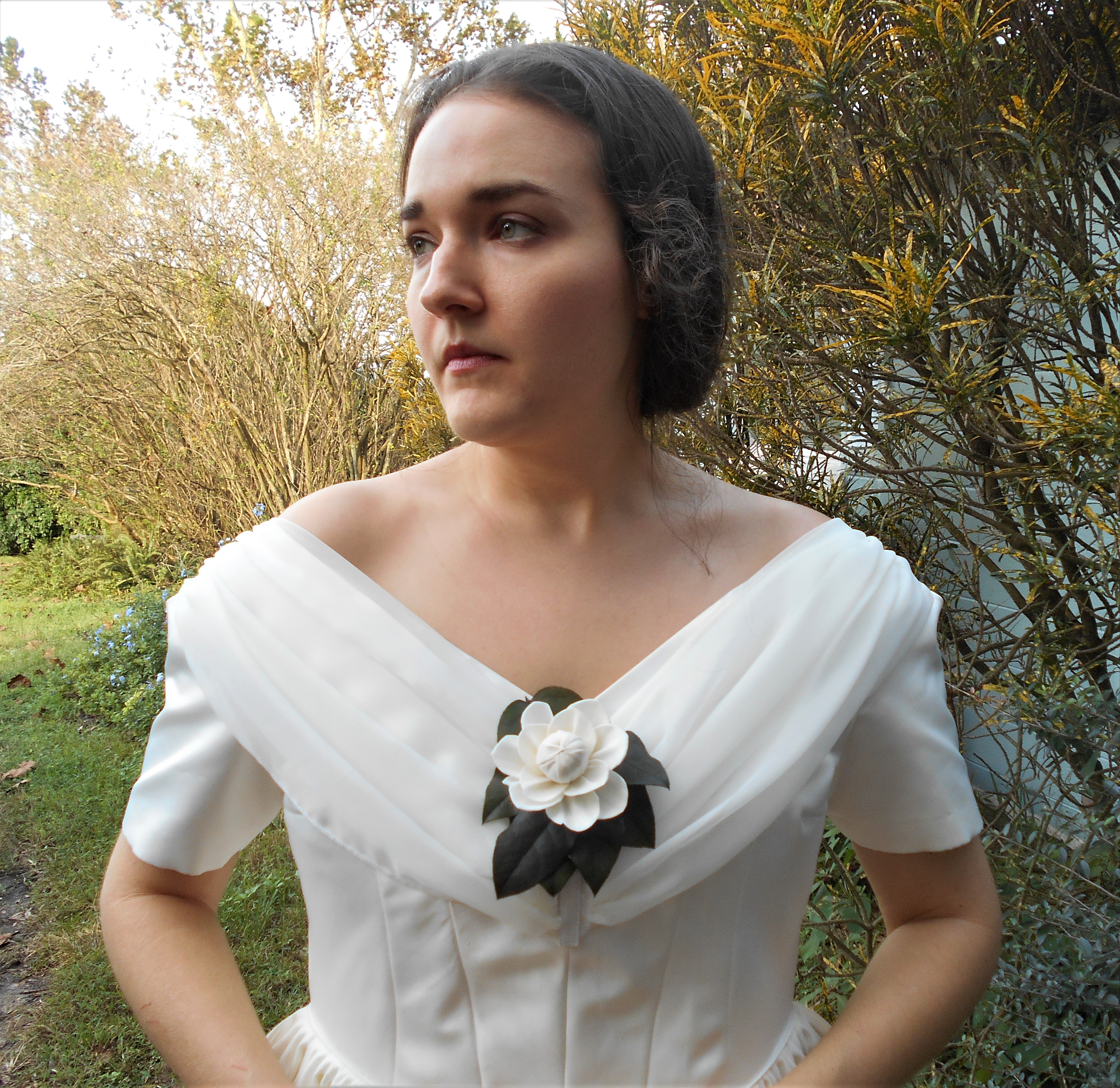 The creamy white satin was stunningly gorgeous, but by far my favorite part of the outfit was the wooden camellia magnet corsage that my cousin, Rosemary, fashioned for me.